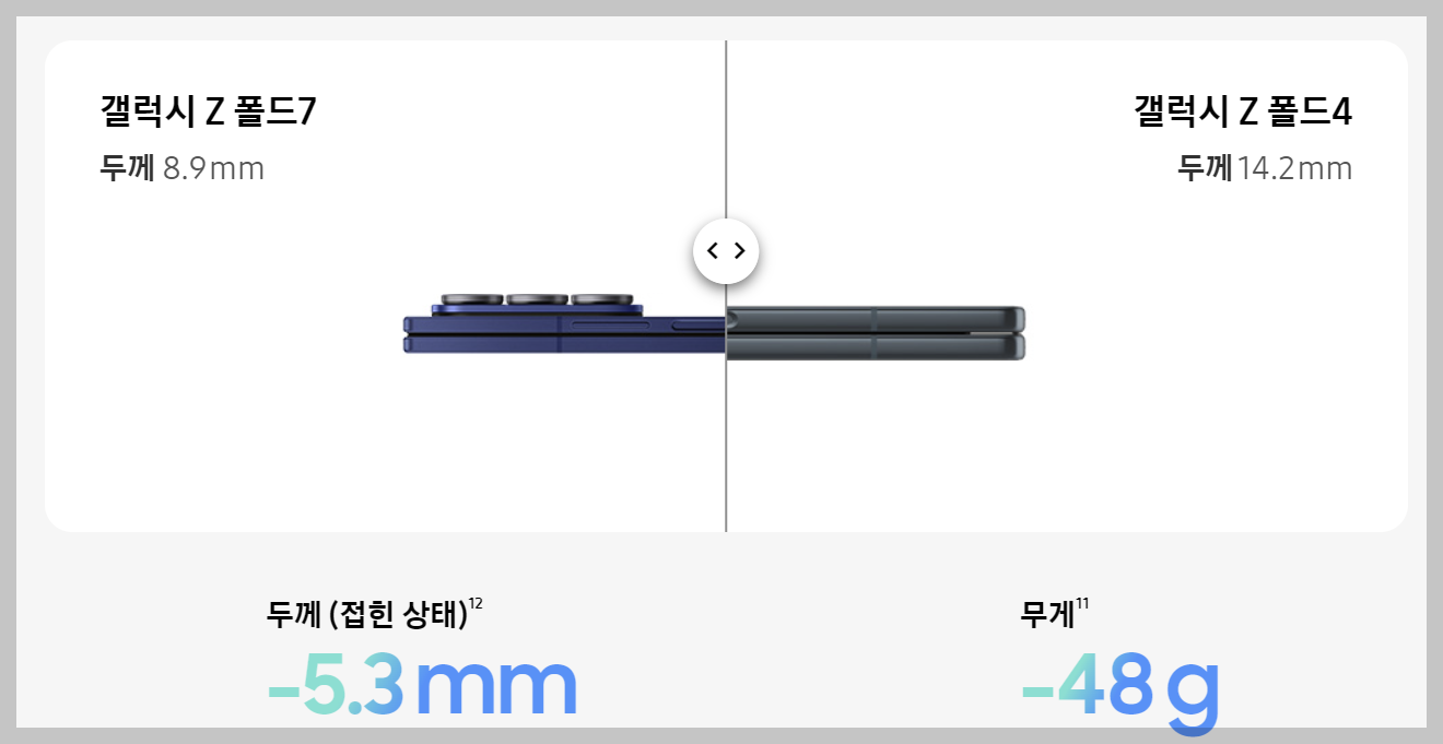 - 두께: 접었을 때 8.9mm / 펼쳤을 때 4.2mm — 현존 삼성 폴더블 중 최고 슬림