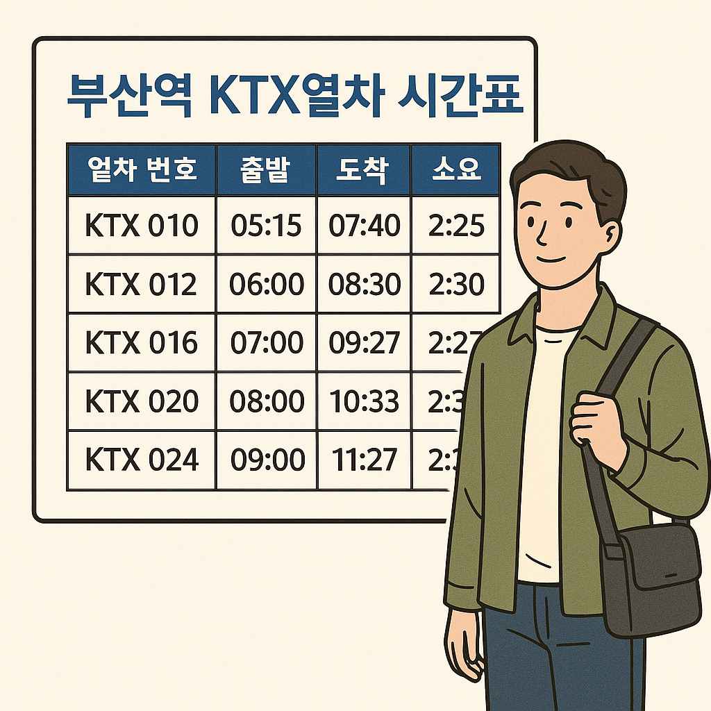※ 위 표는 2025년 상반기 부산역 KTX열차 시간표 일부 예시이며, 실제 운행 시간은 코레일 홈페이지 또는 앱에서 확인해야 합니다.