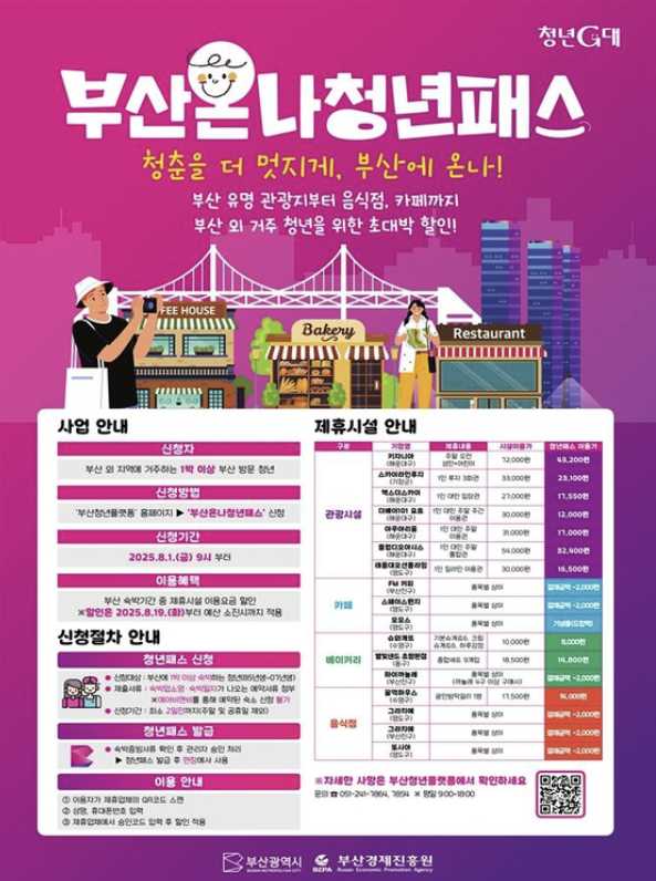 관광지·카페·음식점 등 제휴된 17곳에서 할인 혜택을 받을 수 있는 정책이 바로 부산온나청년패스입니다. - 단순히 관광을 넘어, 부산을 청년 친화적 도시로 알리고 실제로 경제활동에 기여하도록 설계된 프로그램이죠.