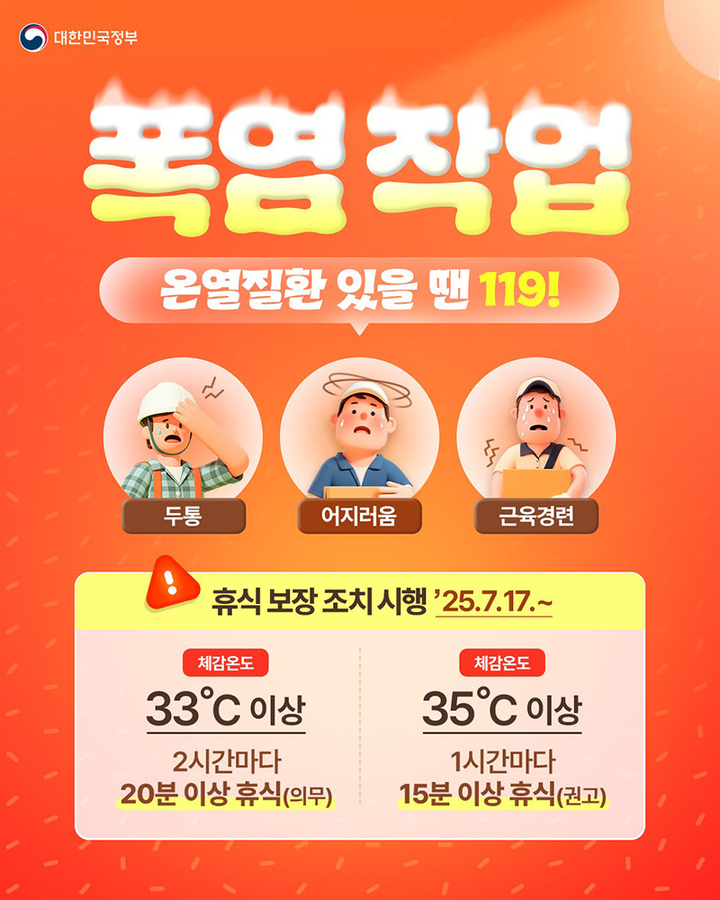 - 온열질환 의심(두통, 어지럼증, 근육경련 등) 시 즉시 119 신고