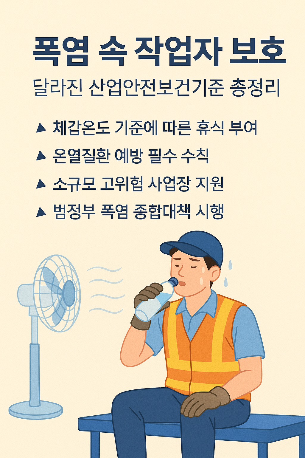 2025년 여름, 유례없는 폭염 속에서도 노동자의 생명과 건강을 지키기 위한 정부의 안전지침이 한층 강화됐습니다. 특히 체감온도에 따라 휴식 의무와 작업 제한이 명확히 규정되었고, 고위험 사업장과 이동노동자를 위한 맞춤형 지원도 이뤄지고 있습니다.