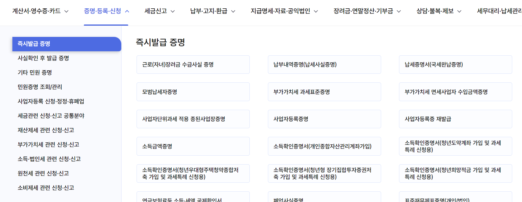 홈택스 발급 가능 증명서 종류