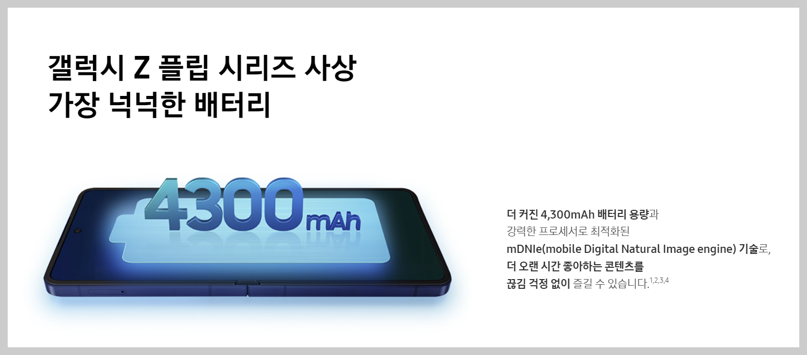 - 배터리: 4,300 mAh, 유선 25W & 무선 충전 지원, 완전 충전 0→50% 30분 내외