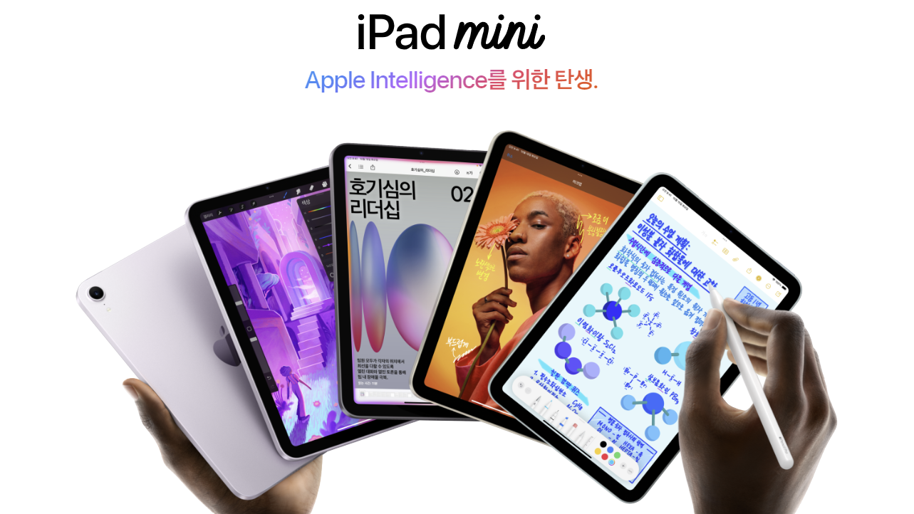 한 손에 쏙 들어오는 크기, 그러나 성능만큼은 맥북 못지않은 태블릿. 2024년 말 출시된 iPad mini 7세대는 A17 Pro 칩과 Apple Intelligence를 품은 첫 ‘초소형 AI 태블릿’입니다. 이동성이 중요한 사용자에게는 현재 가장 가볍고 빠른 선택지가 될 수 있습니다.