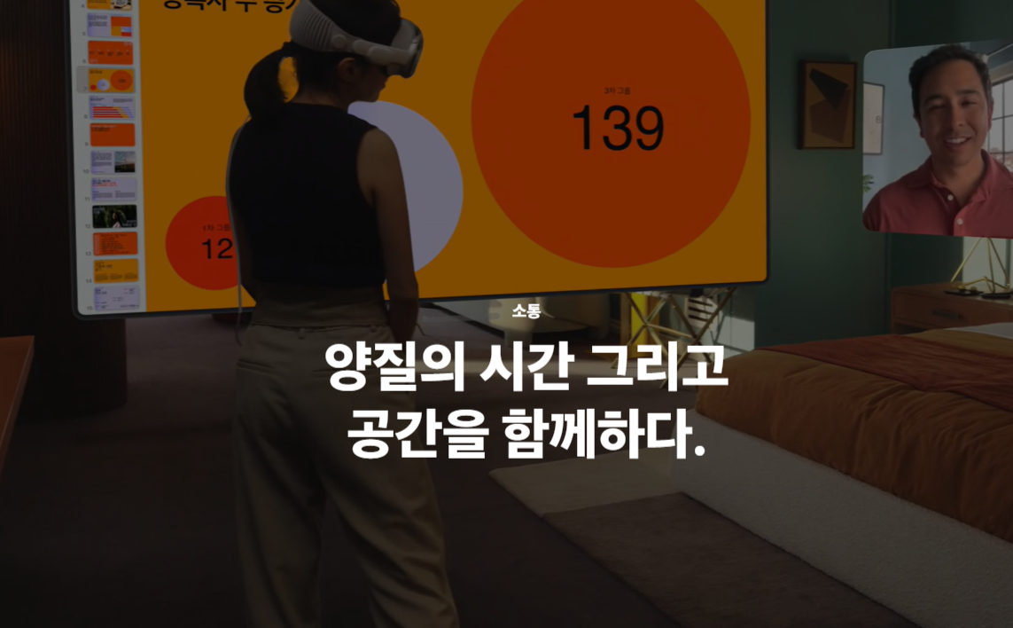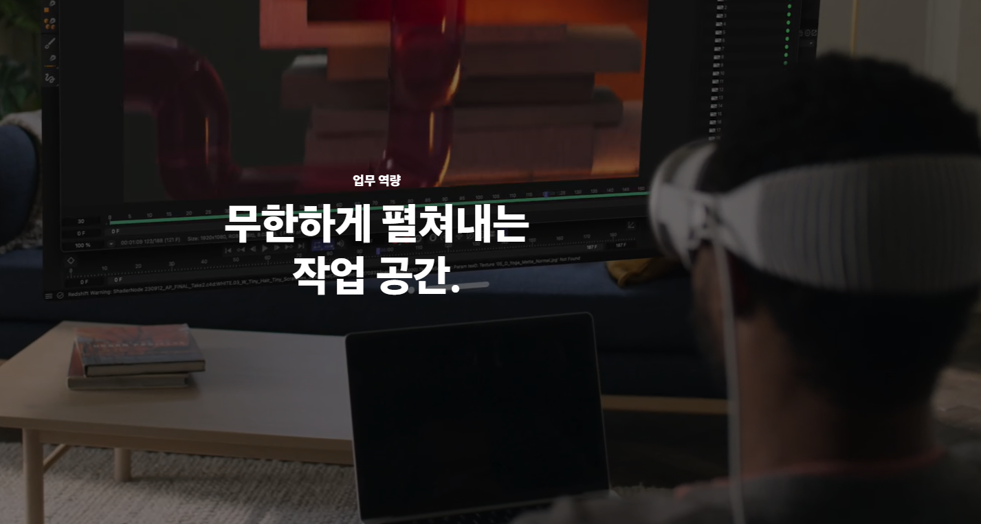 - 앱 호환성: iOS/iPadOS 앱 실행 가능 + Mac 화면을 가상 공간에 연동 가능