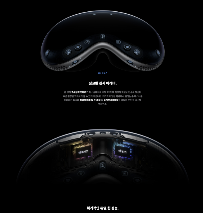 Vision Pro는 M2 칩과 R1 센서 칩이 조합된 듀얼 칩 구조로 작동합니다.