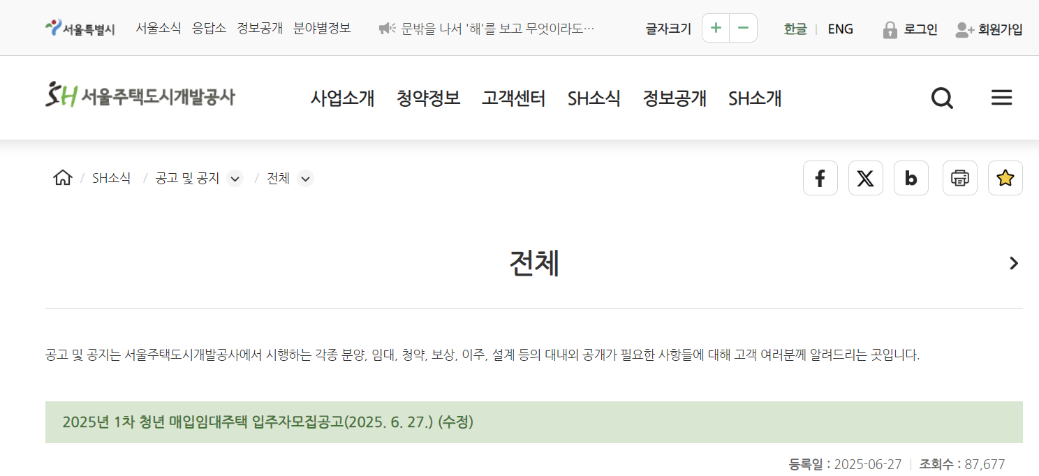 * 1차 SH 청년 매입임대주택 공고문